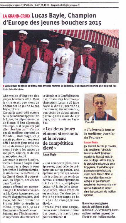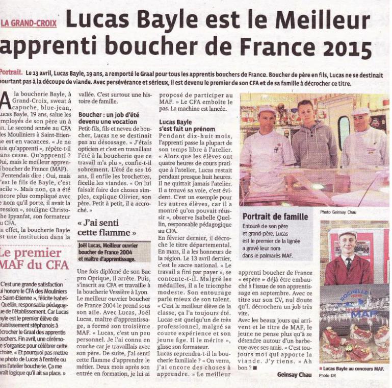 A 19 ans, le 13 avril 2015, à la Rochelle, Lucas Bayle, a été sacré "Meilleur apprenti boucher de France 2015" aussi dit MAF 2015. Félicitation à lui et à son maître d'apprentissage, Joel Lucas, maison Veissiere à Lyon qui lui est Meilleur Ouvrier de France 2004.