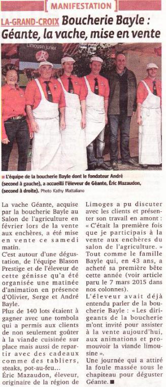 Article du Progrès, réalisé lors de notre animation en magasin autour de "Géante", génisse limousine, achetée lors de la célèbre vente aux enchères du salon de l'agriculture de Paris en 2015. Belle journée autour du label et de l'éleveur. Félicitation aux gagnants (+ de 120 ).