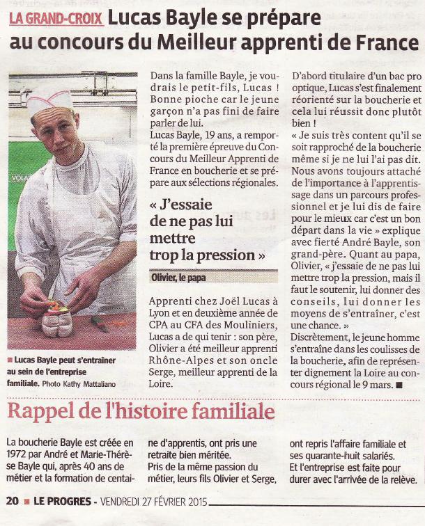 27 ans après le père, place au fils !!! En effet, Lucas Bayle, Fils d'Olivier Bayle a remporté le concours régional (Rhône Alpes) du meilleur apprenti boucher. Prix que son père a remporté il y a quelques 27 années ! Place à la finale du meilleur apprenti boucher de France qui se déroulera les 12 et 13 avril à la Rochelle. Objectif faire mieux que son père ... et pourquoi pas finir dans les 3 premiers et recevoir le titre ?! Une belle transmission du métier depuis déjà 3 générations