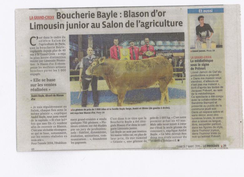 Lors du salon de l’agriculture 2015, la famille Bayle a participé pour la première fois à la célèbre vente aux enchères, et a acheté "Géante" génisse de près de 1000kg. Un prix: le blason d'or nous a également été remis dans la catégorie Génisse limousine, une grande fierté, merci à l'équipe Blason Prestige.