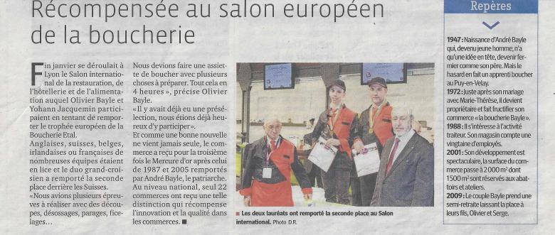 Dimanche 27 janvier 2013, à Lyon, se déroulait le Trophée Européen de Boucherie d'Etal à l'occasion du SIRHA, Salon International de la Restauration. Olivier Bayle et Yoan Jacquemin ont remporté la deuxième place.