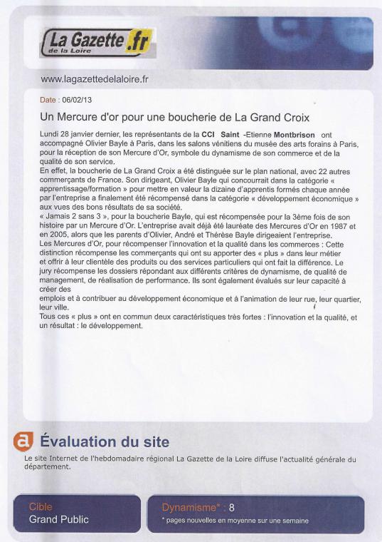 Pour la troisième fois en 40 ans, la Boucherie Bayle s'est vu décerner un Mercure d'Or (1987 , 2005 et 2012). Peu d'entreprises françaises peuvent prétendre à cet exploit. La chaine locale Stéphanoise : TL7 nous a reçu à cette occasion.