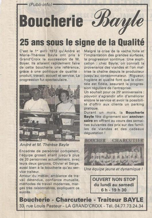 "Durant un mois la Boucherie Bayle fête dignement son anniversaire en offrant au cours des semaines suivantes des prix sur des familles de viandes et des cadeaux dégustations "