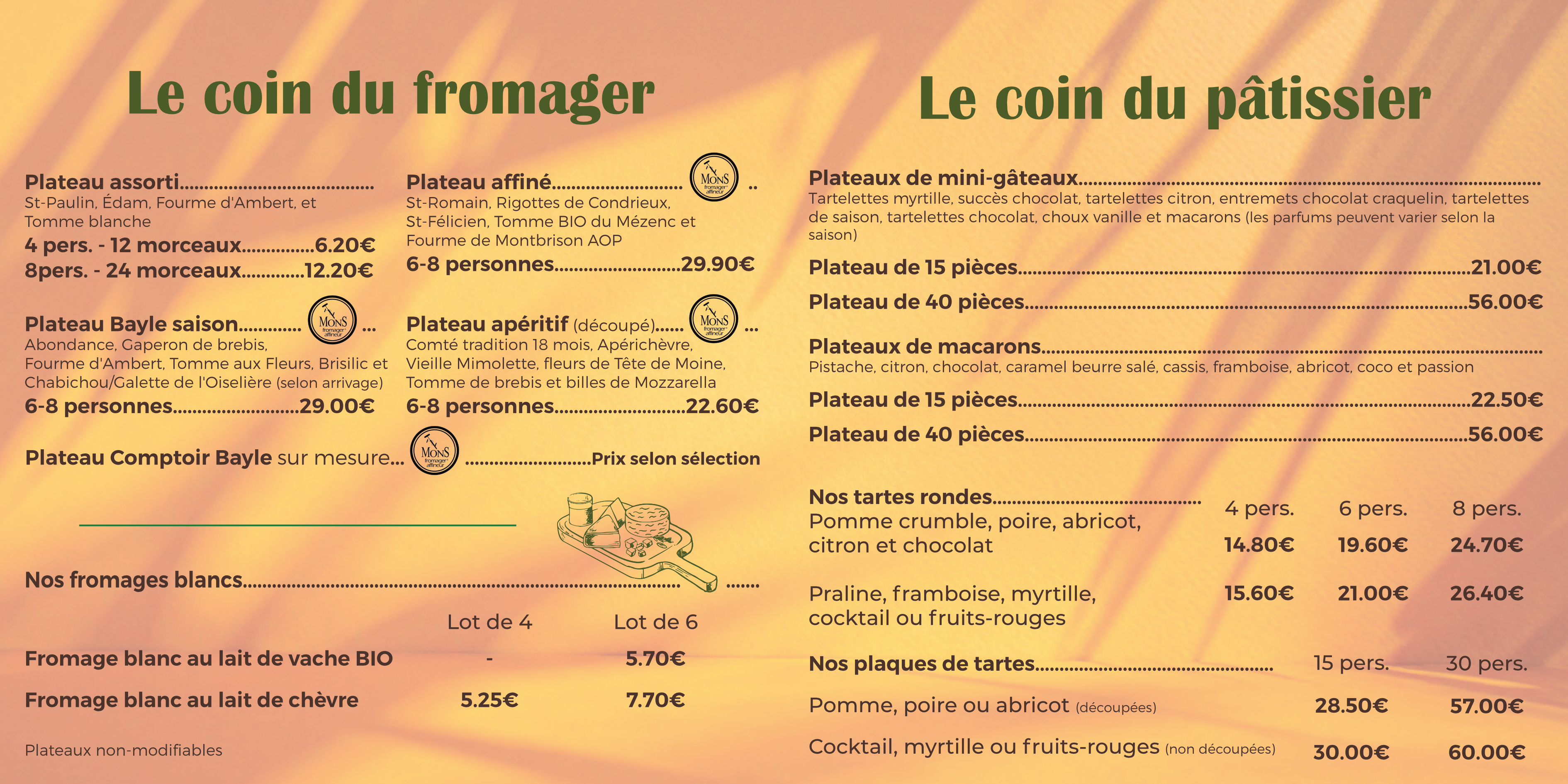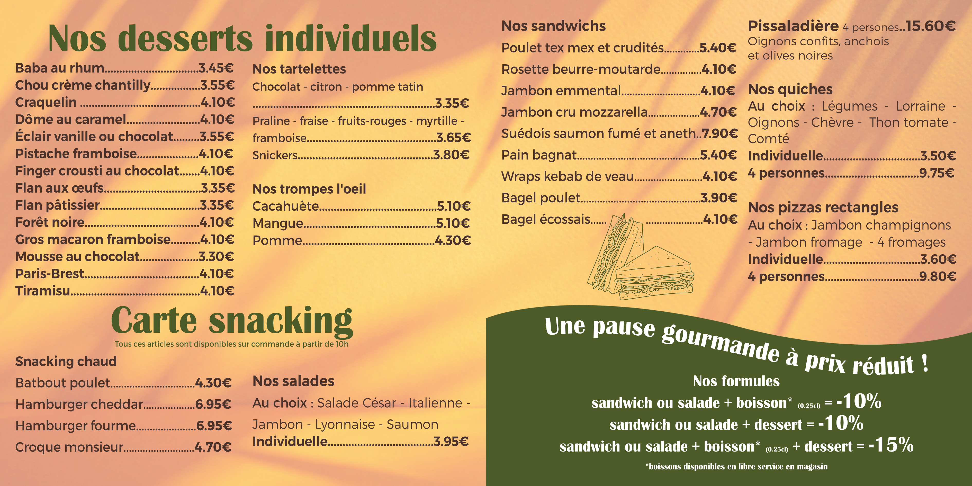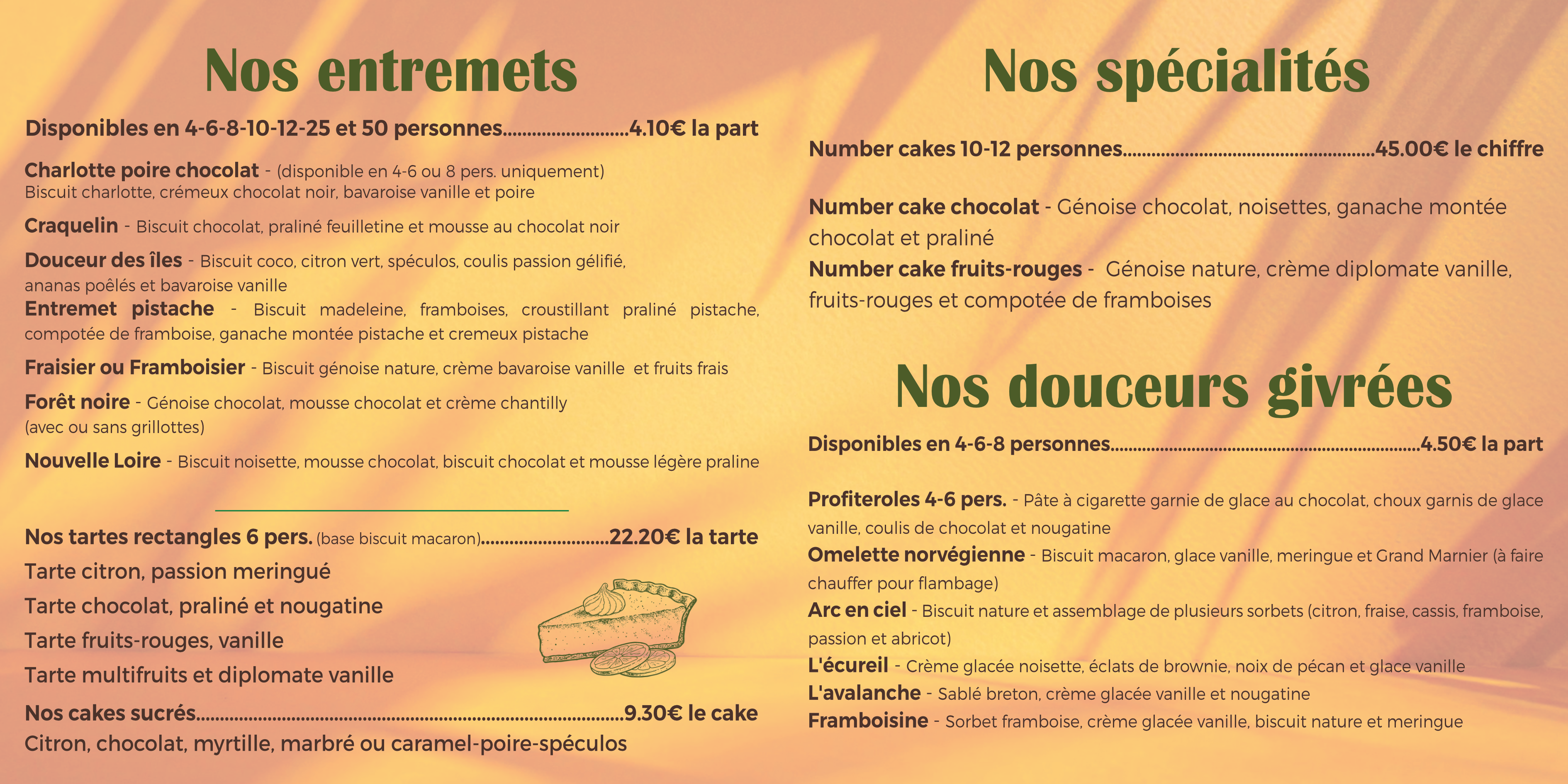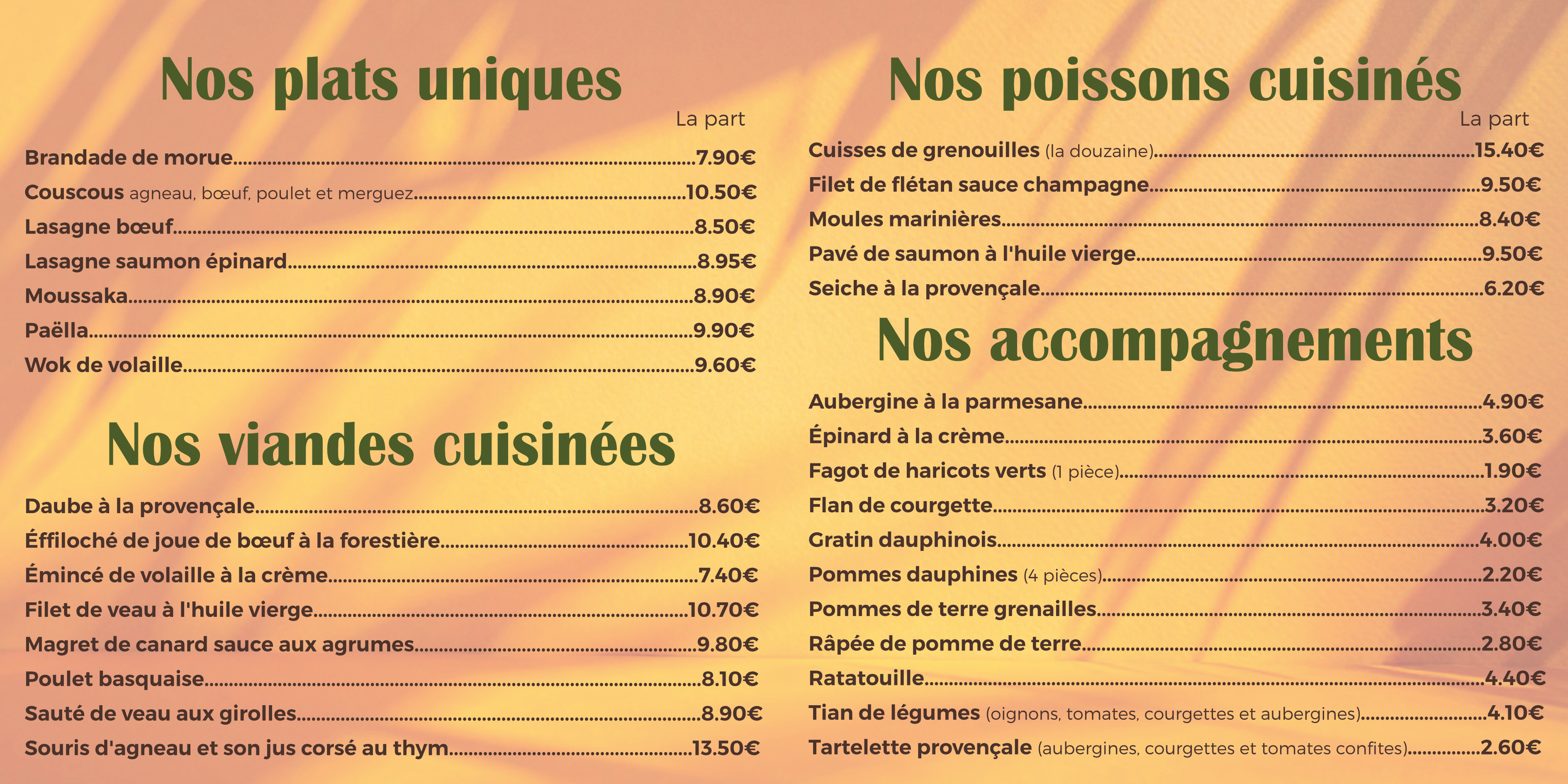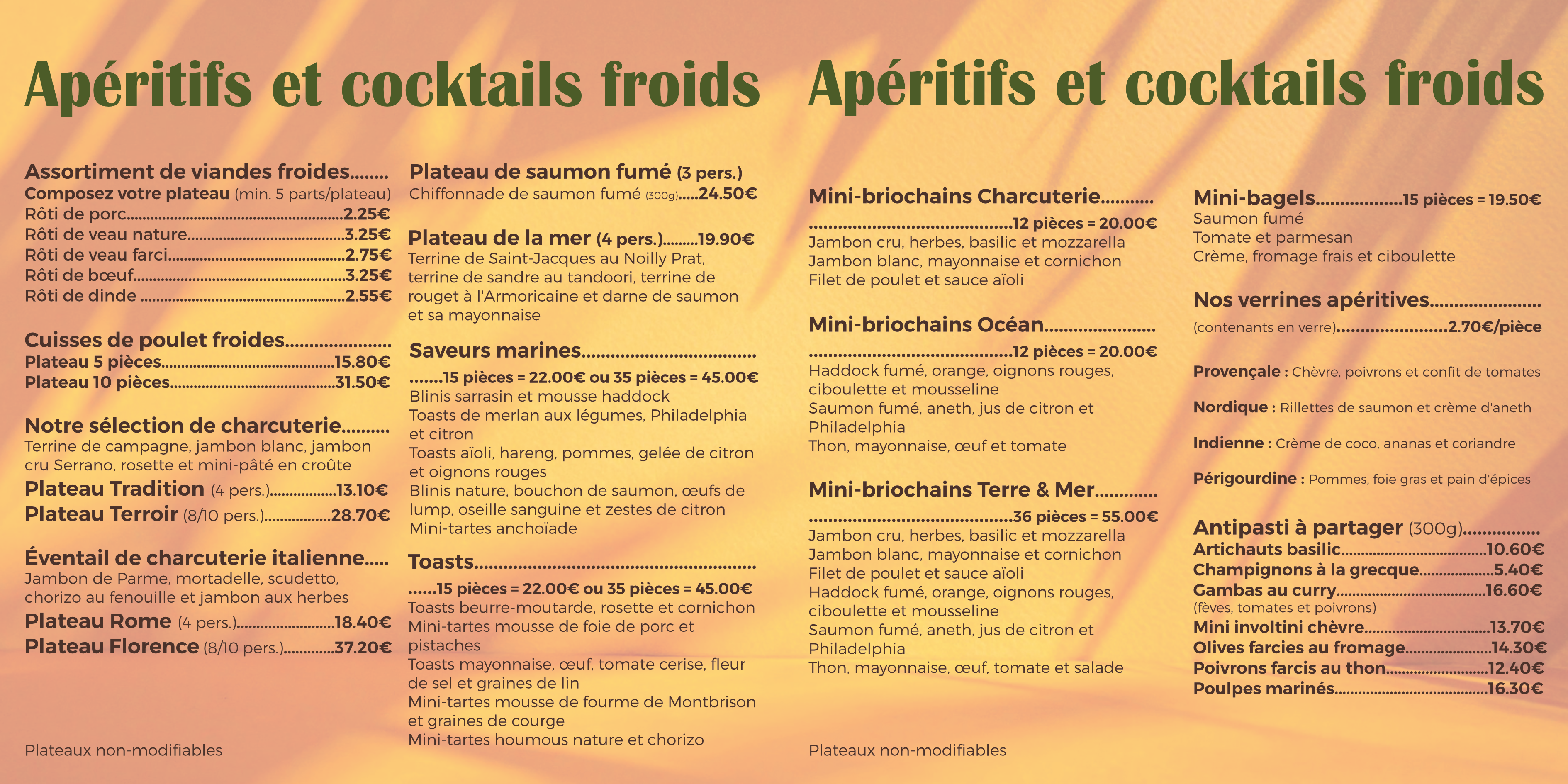 Pensée pour vos repas en famille, vos événements ou vos moments de convivialité, cette carte met à l’honneur des produits de saison, des recettes fraîches et gourmandes, ainsi que tout le savoir-faire de nos équipes.