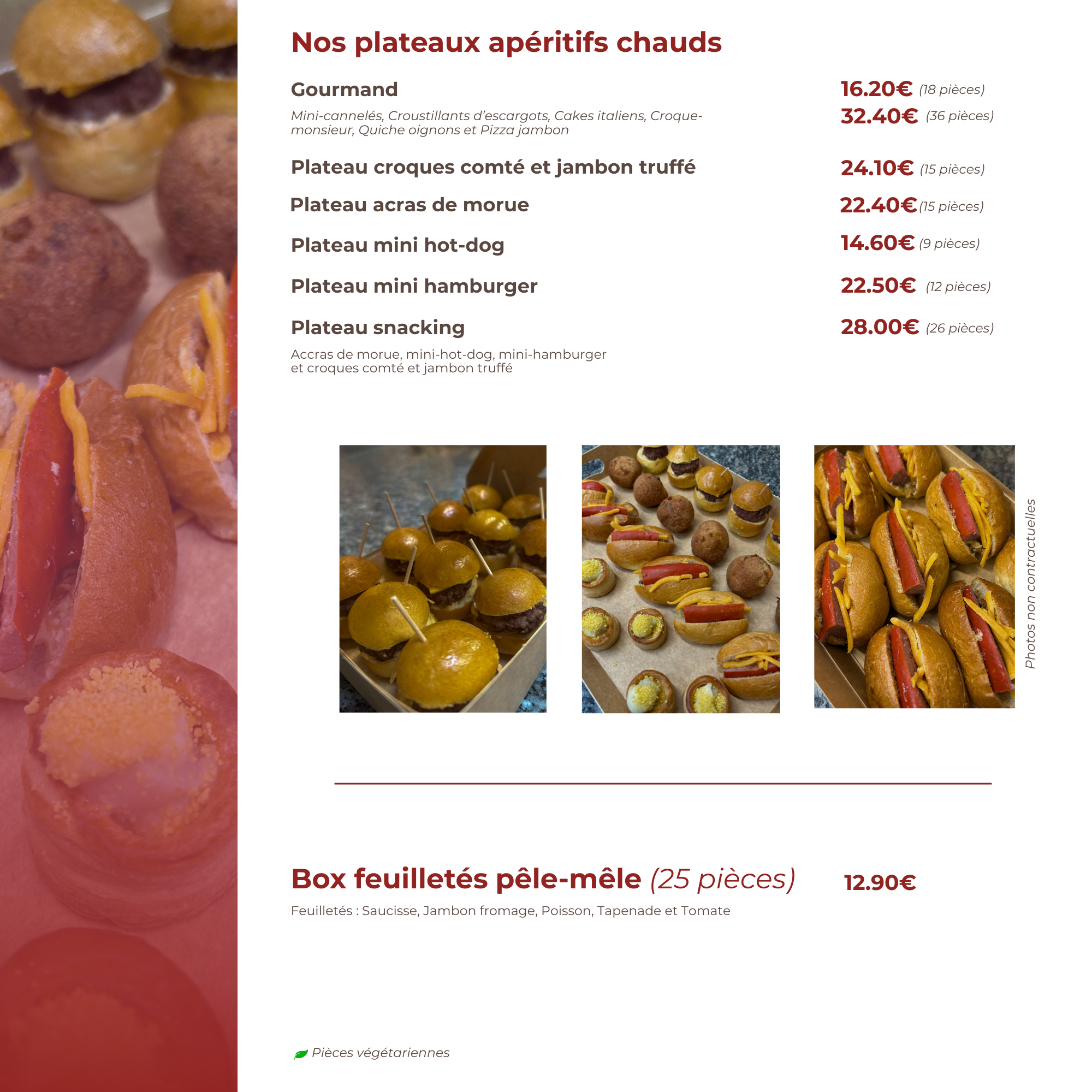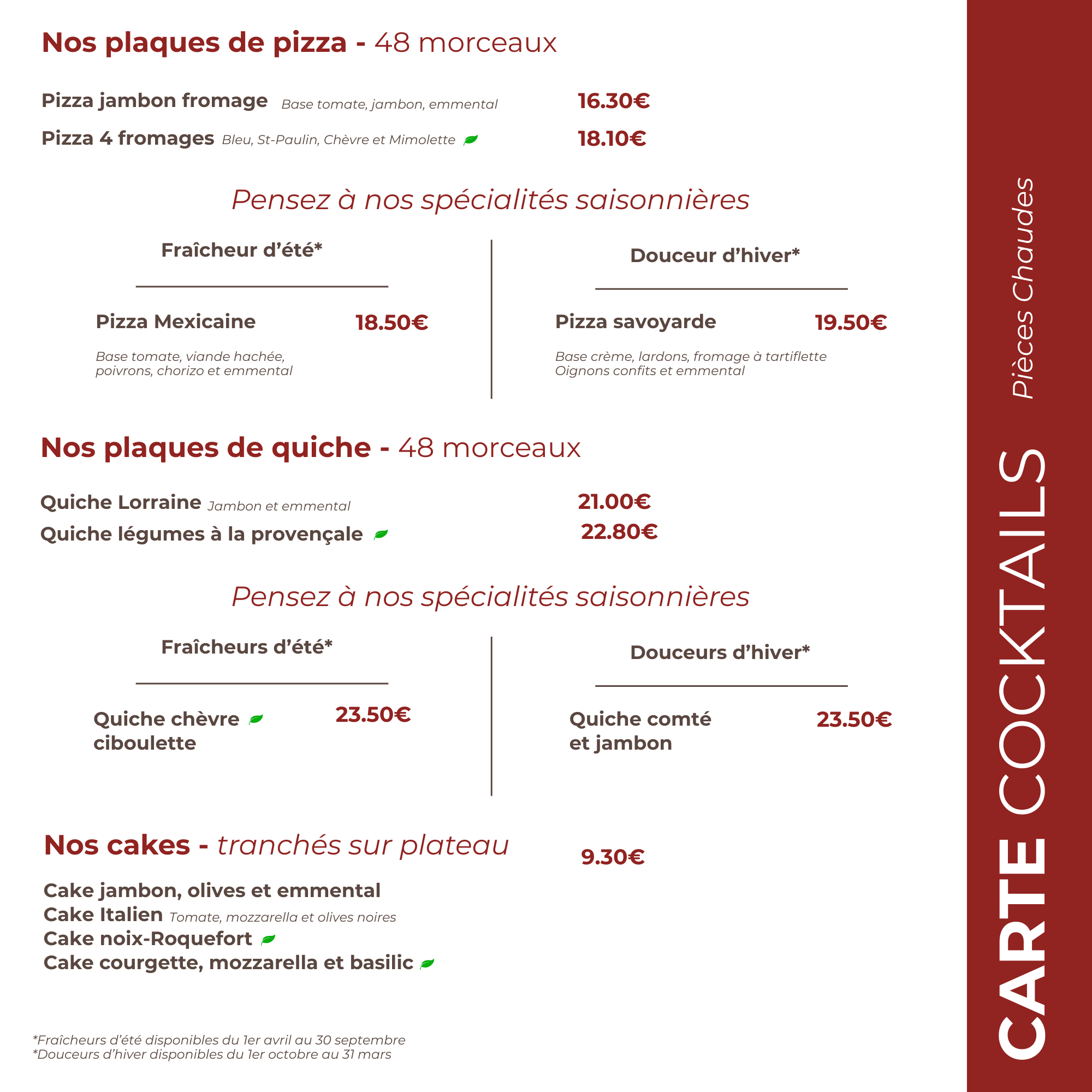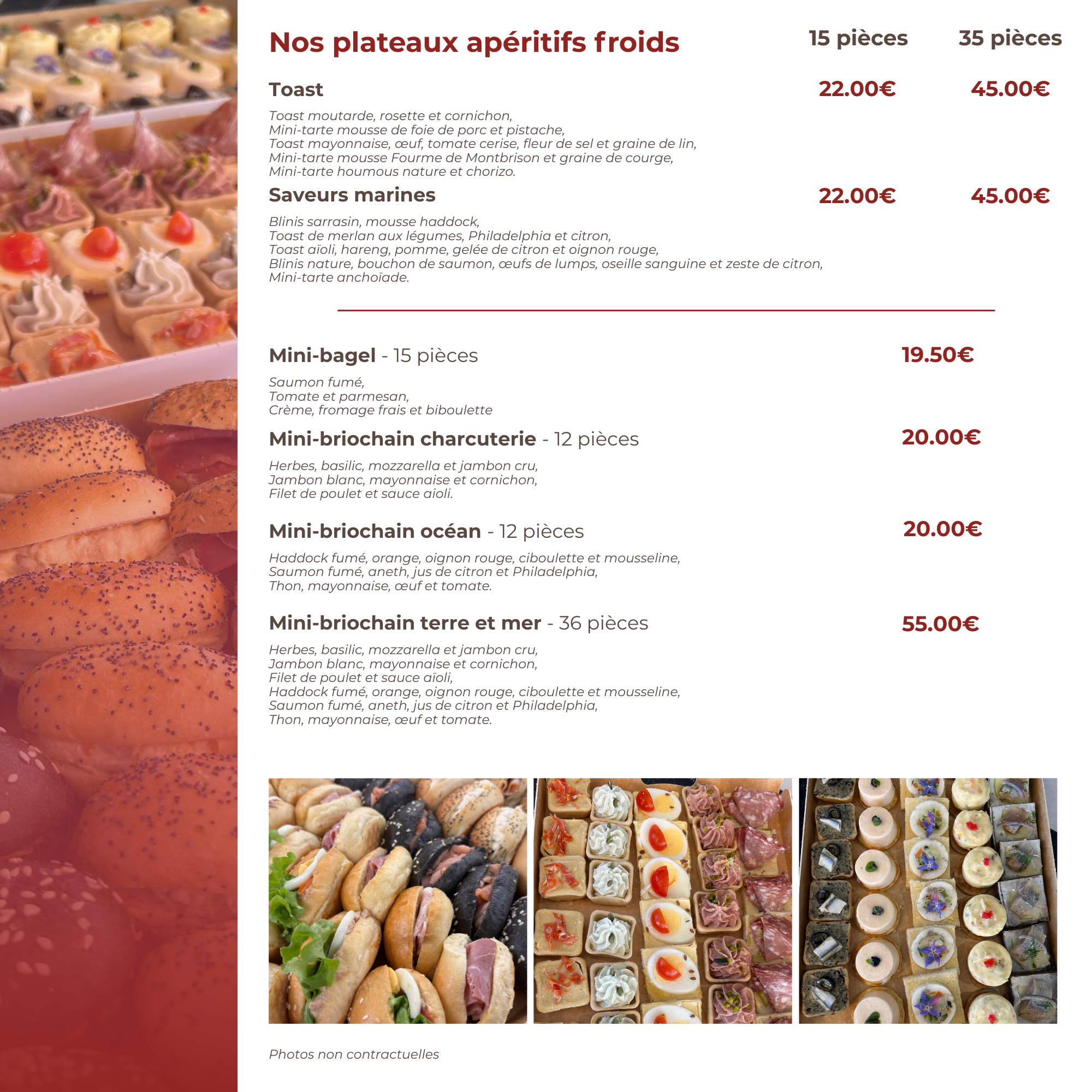 "De l'entrée au dessert" nous mettons un point d'honneur à vous accompagner : des pièces froides (pain surprise, toast, verrines fraîcheur), en passant par les pièces chaudes (Plaques de pizza et de quiche, croustillants d'escargot, accras de morue, ...) pour finir par une note sucrée (mini-gateaux et macarons).
