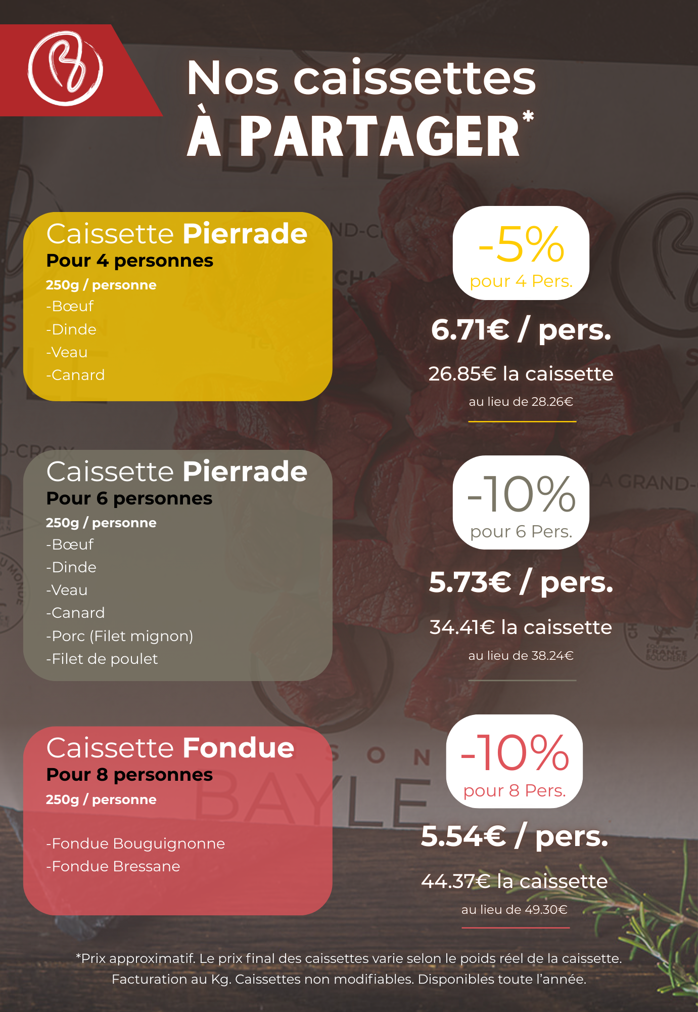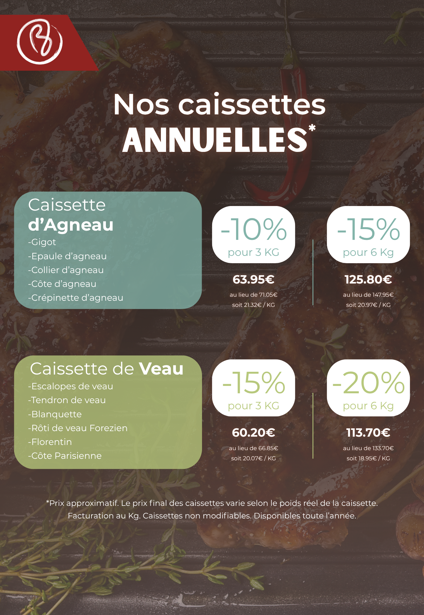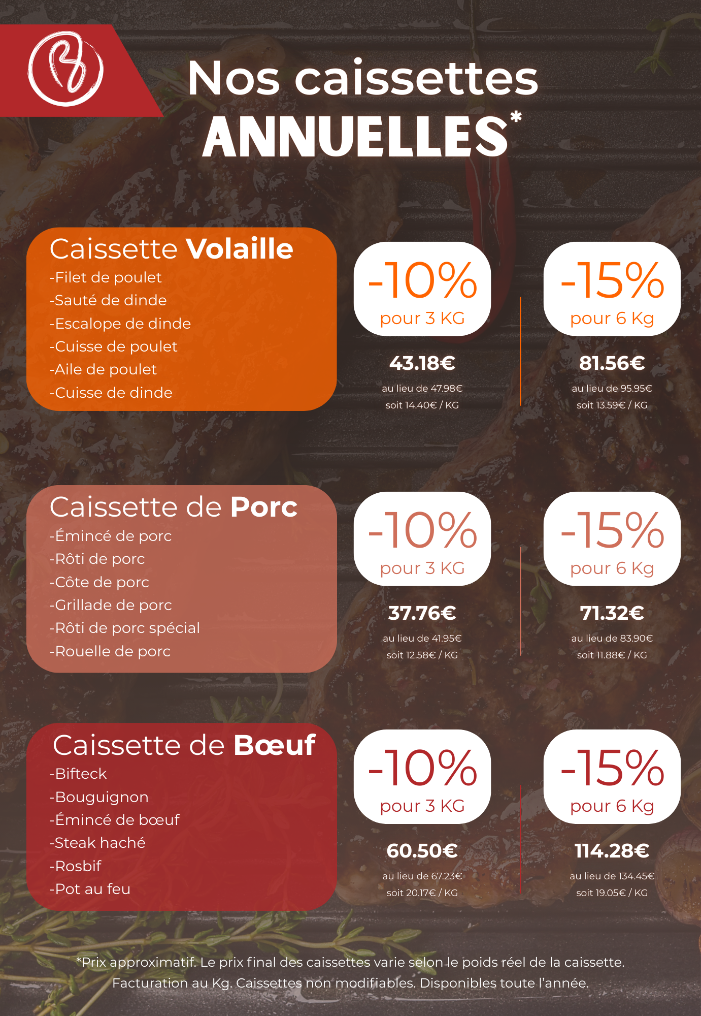 Pour rappel : Tous les prix sont approximatifs. Le prix final des caissettes varie selon le poids réel de la caissette. Facturation au Kg. Assortiment prédéfini et non modifiable.